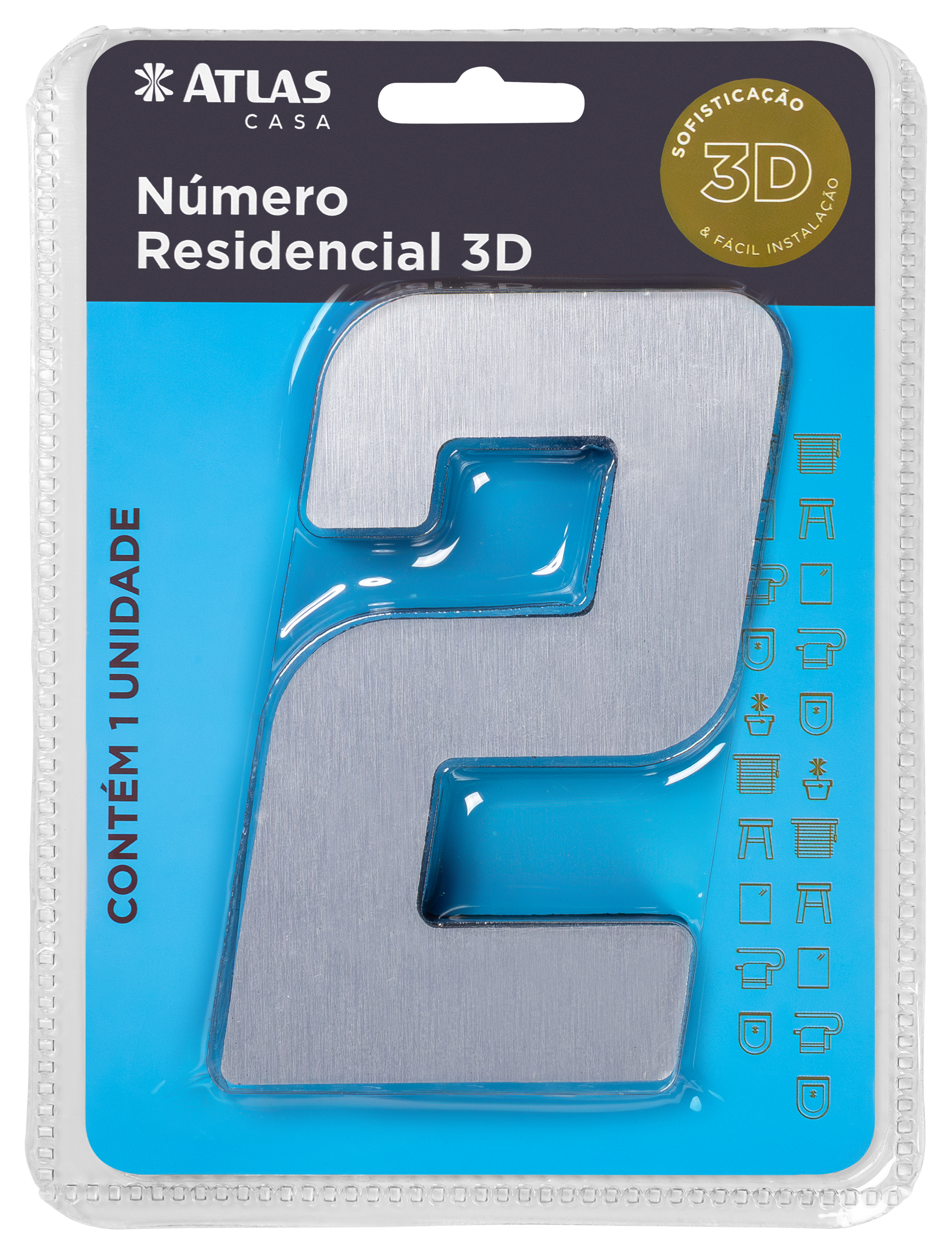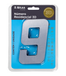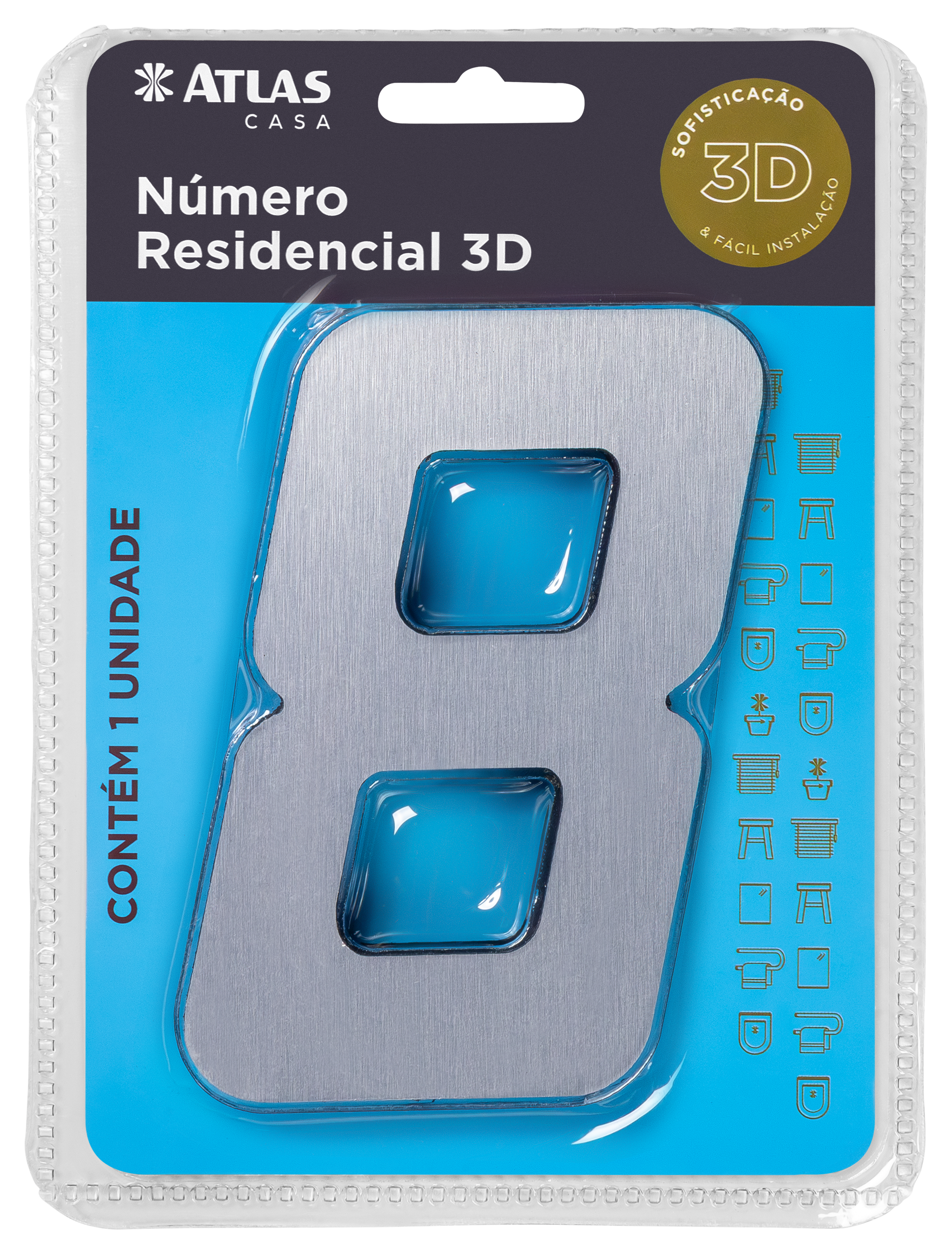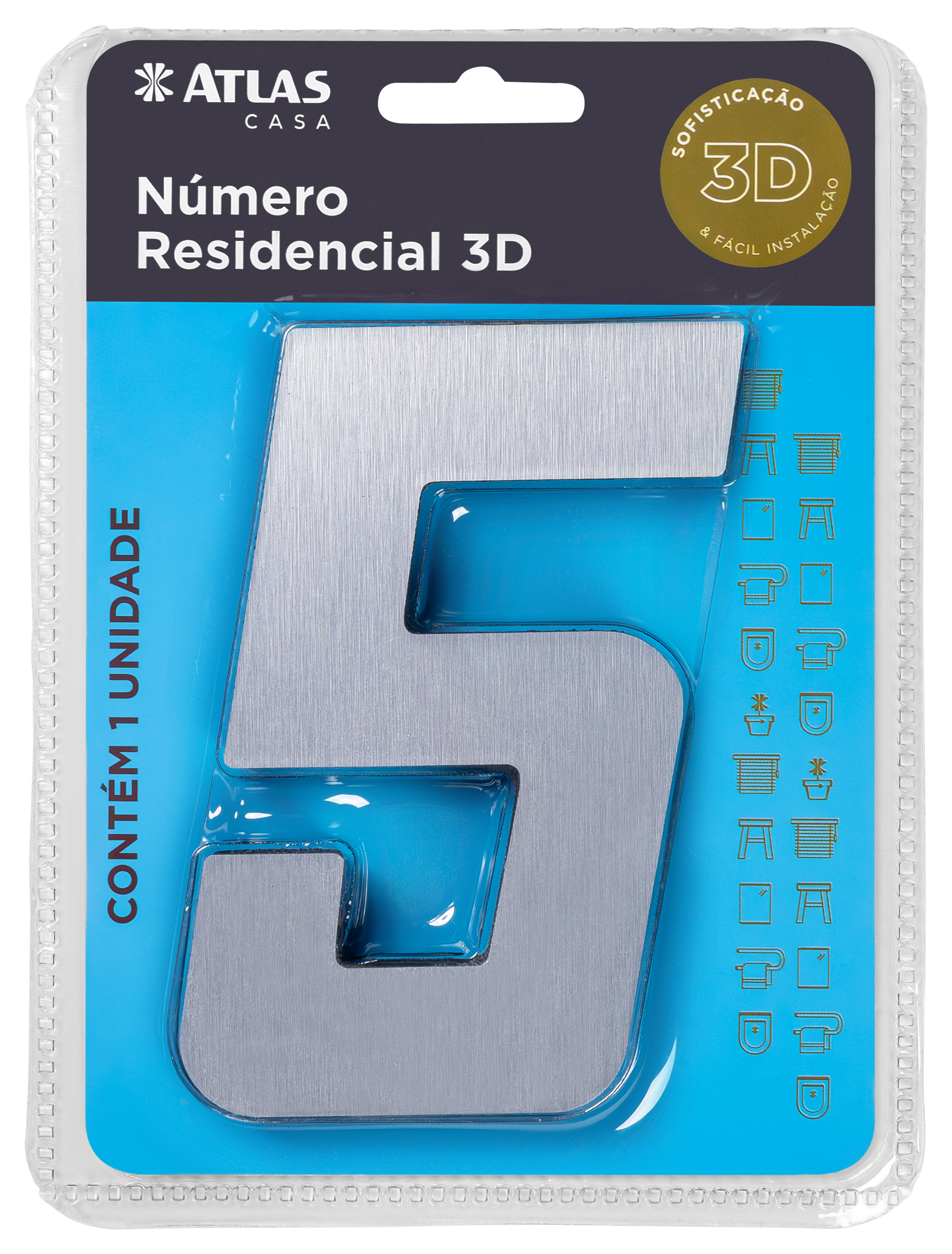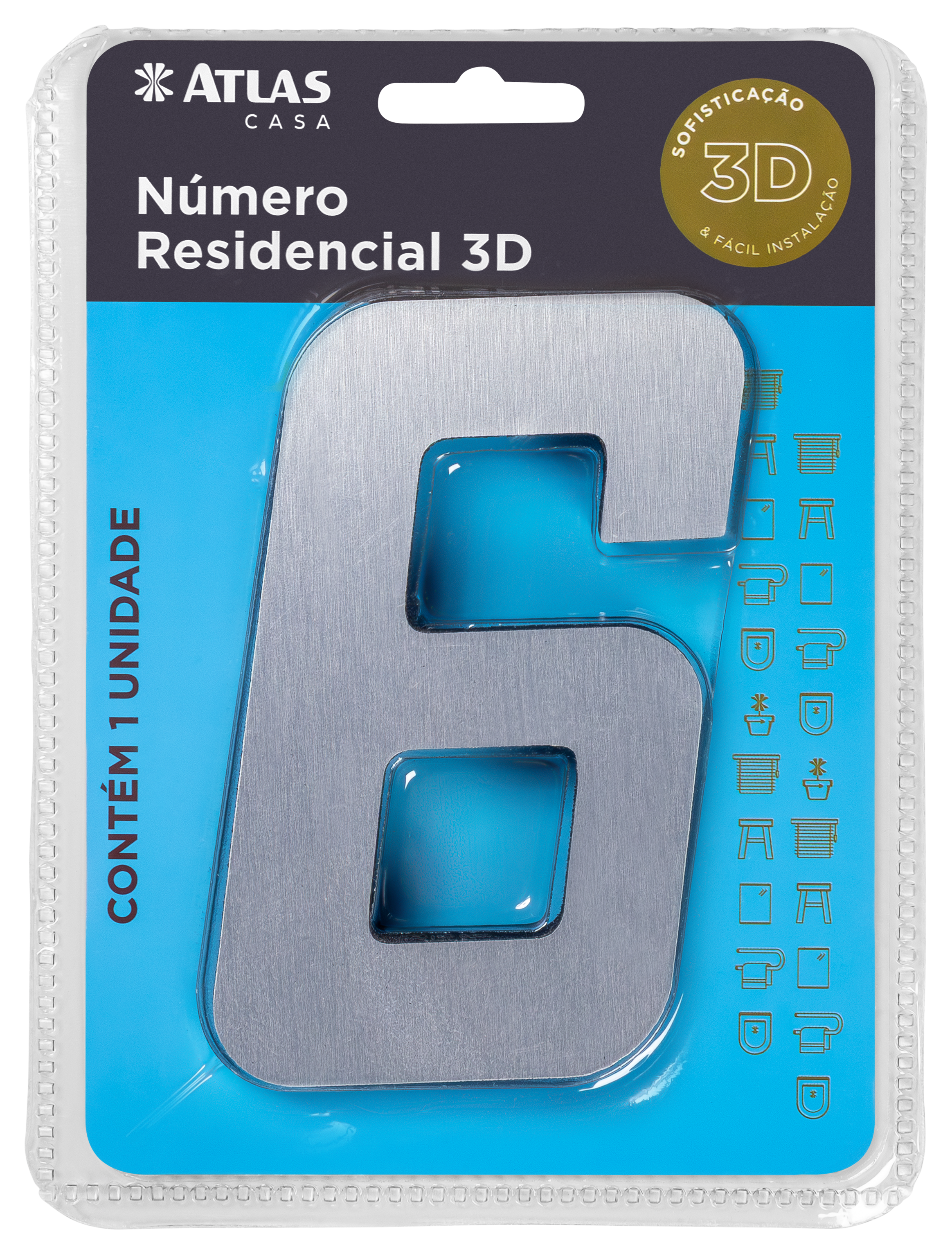 Número residencial fabricado en aluminio compuesto (ACM), apto para uso en interiores o exteriores. Cuenta con cinta adhesiva doble faz transparente para fijación directa en la pared, sin necesidad de perforaciones ni herramientas para la instalación.