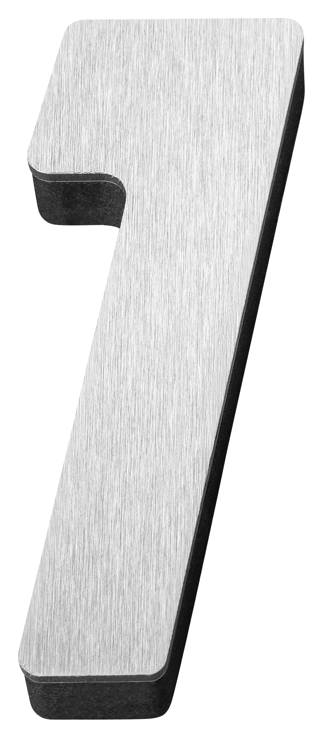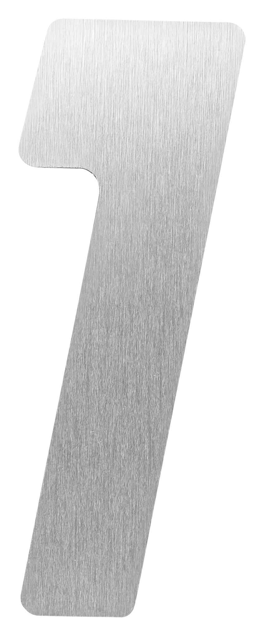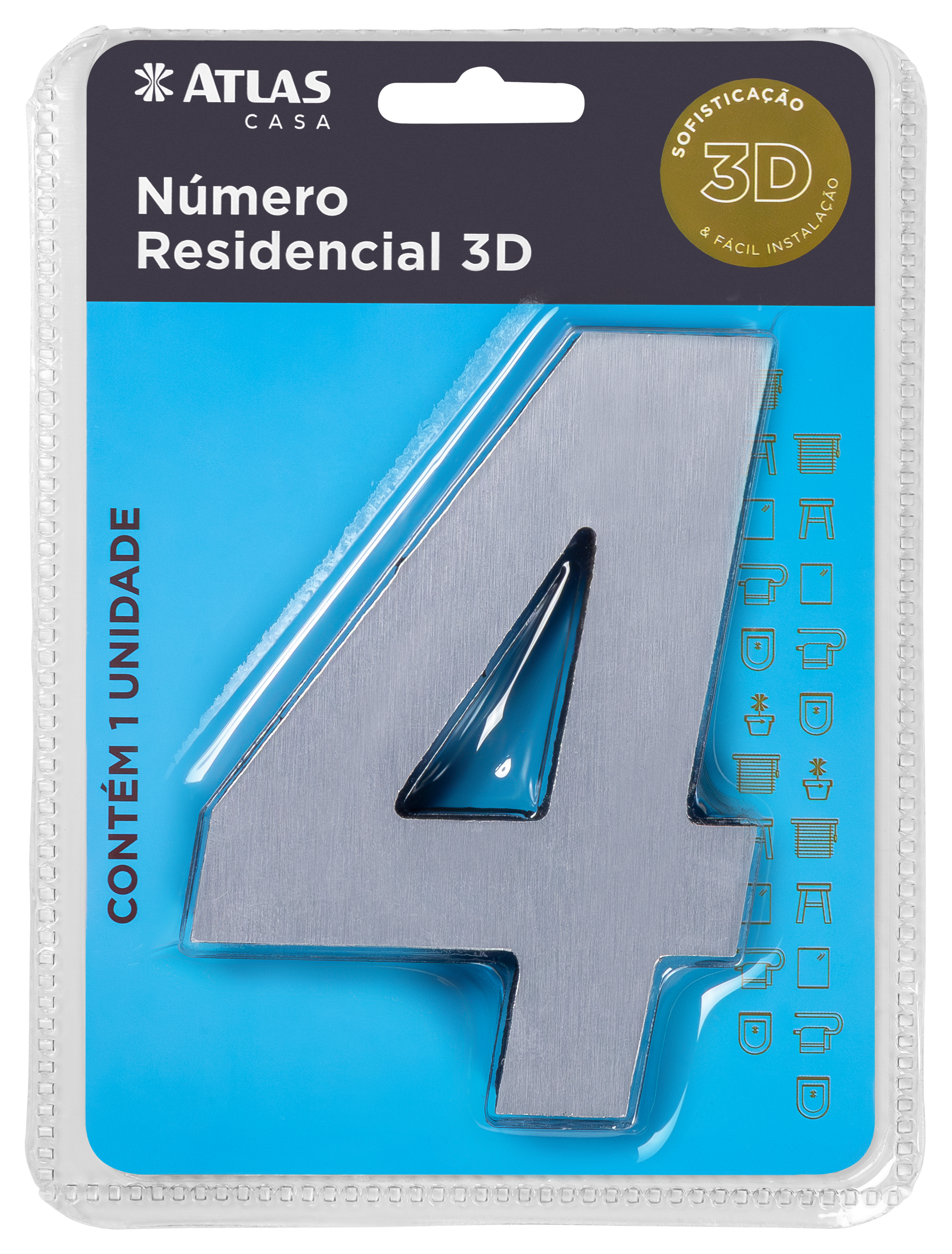 Número residencial fabricado en aluminio compuesto (ACM), apto para uso en interiores o exteriores. Cuenta con cinta adhesiva doble faz transparente para fijación directa en la pared, sin necesidad de perforaciones ni herramientas para la instalación.