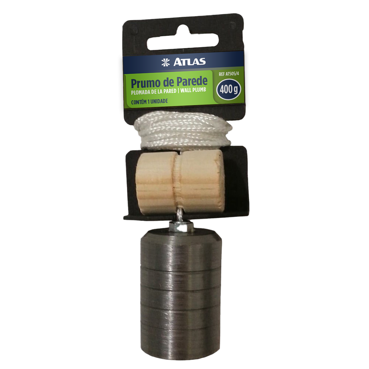 Prumo de parede com corpo metálico de 400 g e 500g, guia ou taco em madeira tratada e cordão de nylon.